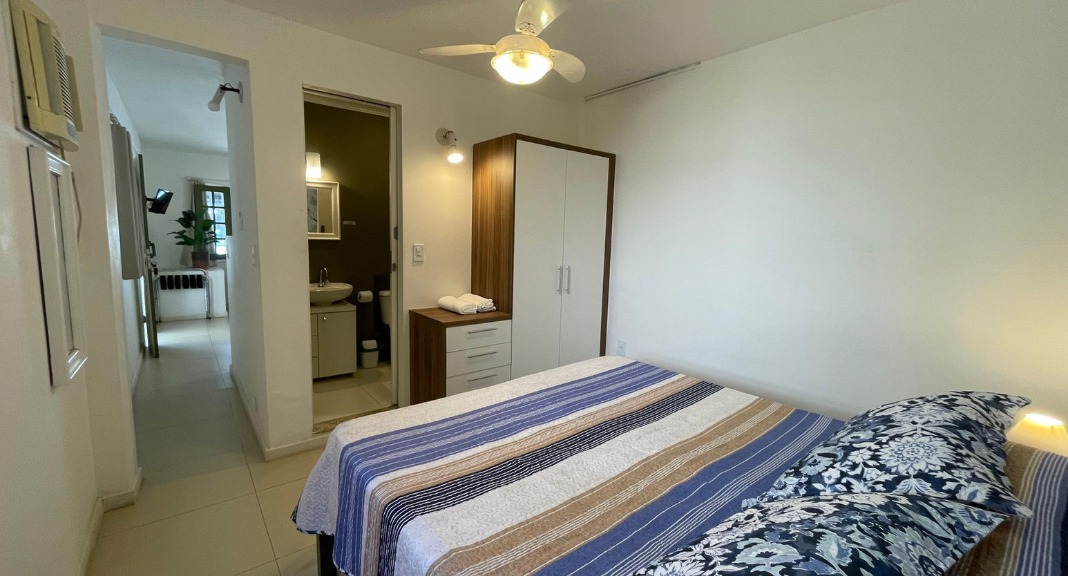 Apartamento com: duas camas de solteiro que podem ficar separadas ou ser arrumadas como cama de casal, ventilador de teto e ar condicionado, banheiro completo, sala com cozinha tipo americana (fogão e forno, frigobar, utensílios de cozinha e panelas), mesa e cadeiras, TV e WI-FI. O quarto e a sala conformam um ambiente conjugado, não tem separação nem privacidade. Lençóis e toalhas limpas estão incluídos nos alugueis.
